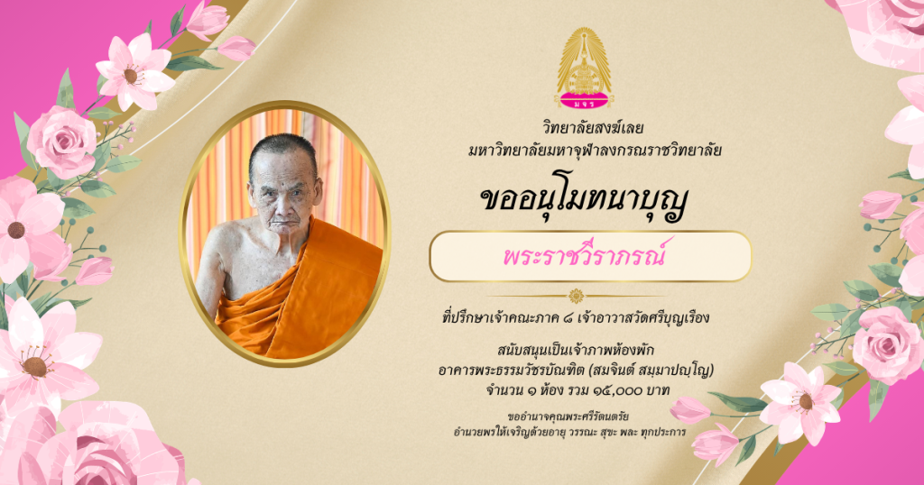 ขออนุโมทนาบุญพระราชวีราภรณ์ สนับสนุนเป็นเจ้าภาพห้องพัก อาคารพระธรรมวัชรบัณฑิต (สมจินต์ สมฺมาปญฺโญ)
