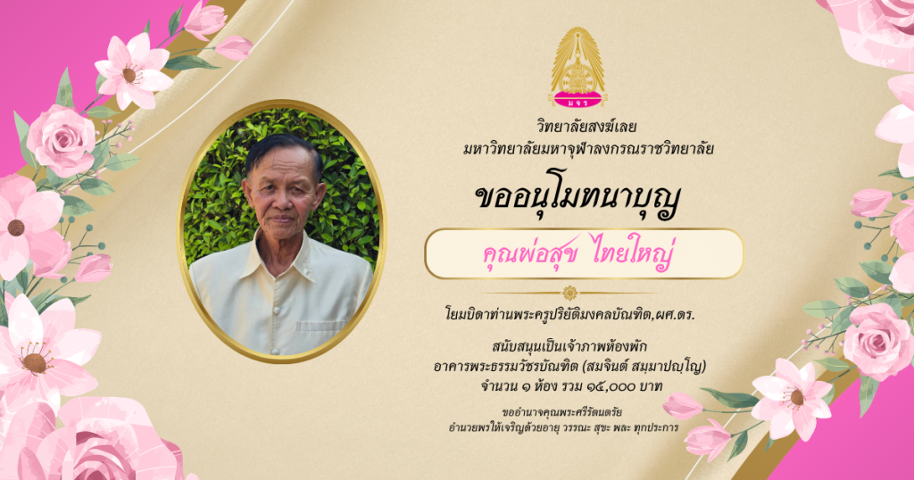 ขออนุโมทนาบุญคุณพ่อสุข ไทยใหญ่สนับสนุนเป็นเจ้าภาพห้องพัก อาคารพระธรรมวัชรบัณฑิต (สมจินต์ สมฺมาปญฺโญ