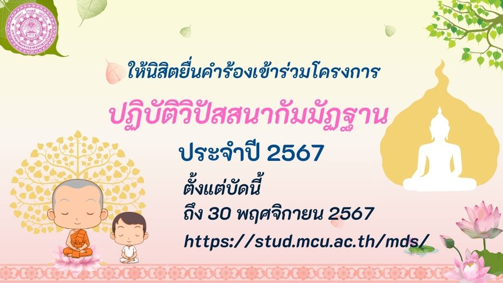 แจ้งนิสิตยื่นคำร้องเข้าร่วมโครงการปฏิบัติวิปัสสนากัมมัฏฐาน ประจำปี 2567