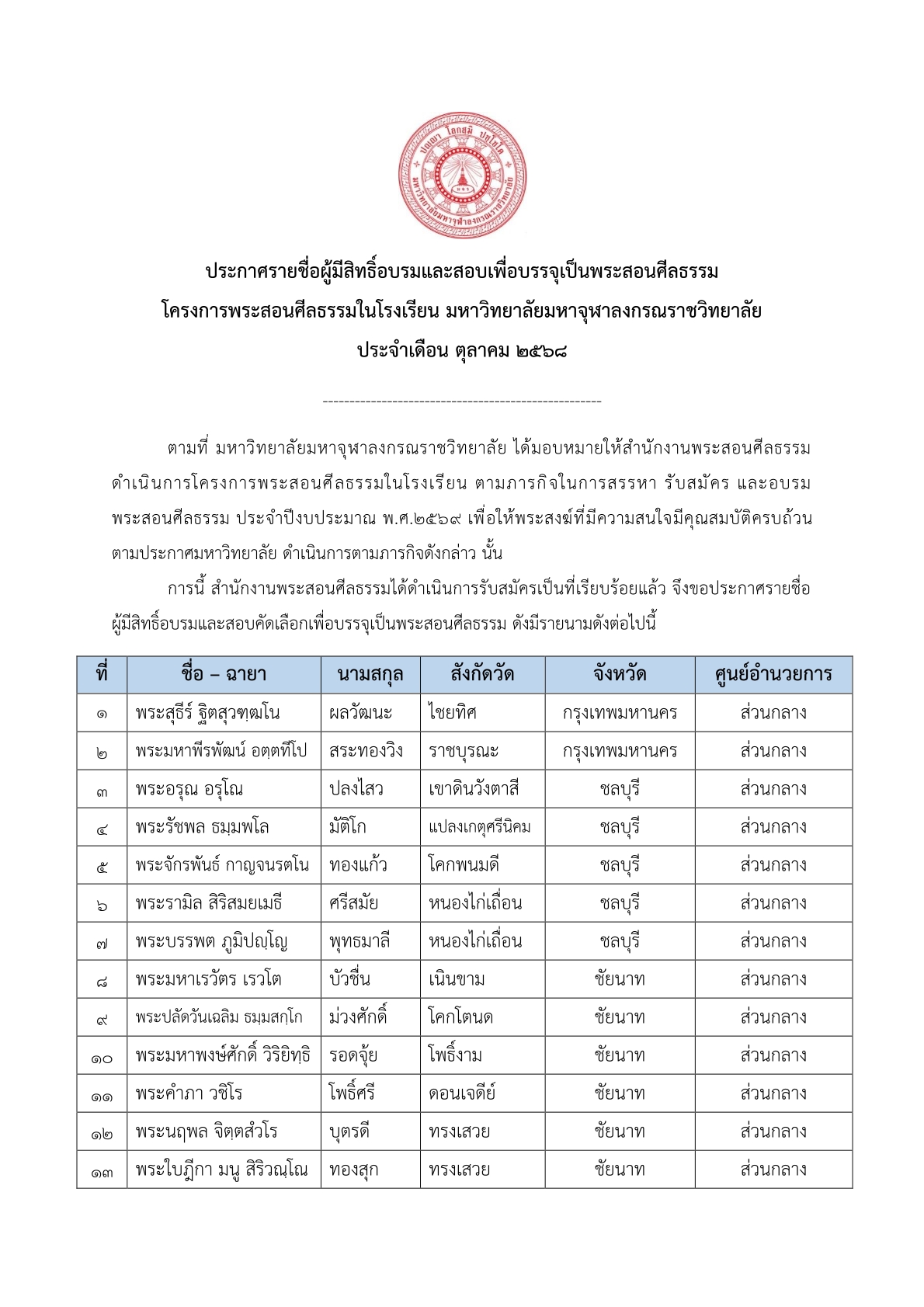 ประกาศรายชื่อผู้มีสิทธิ์อบรมและสอบเพื่อบรรจุเป็นพระสอนศีลธรรม ประจำเดือน ตุลาคม ๒๕๖๘