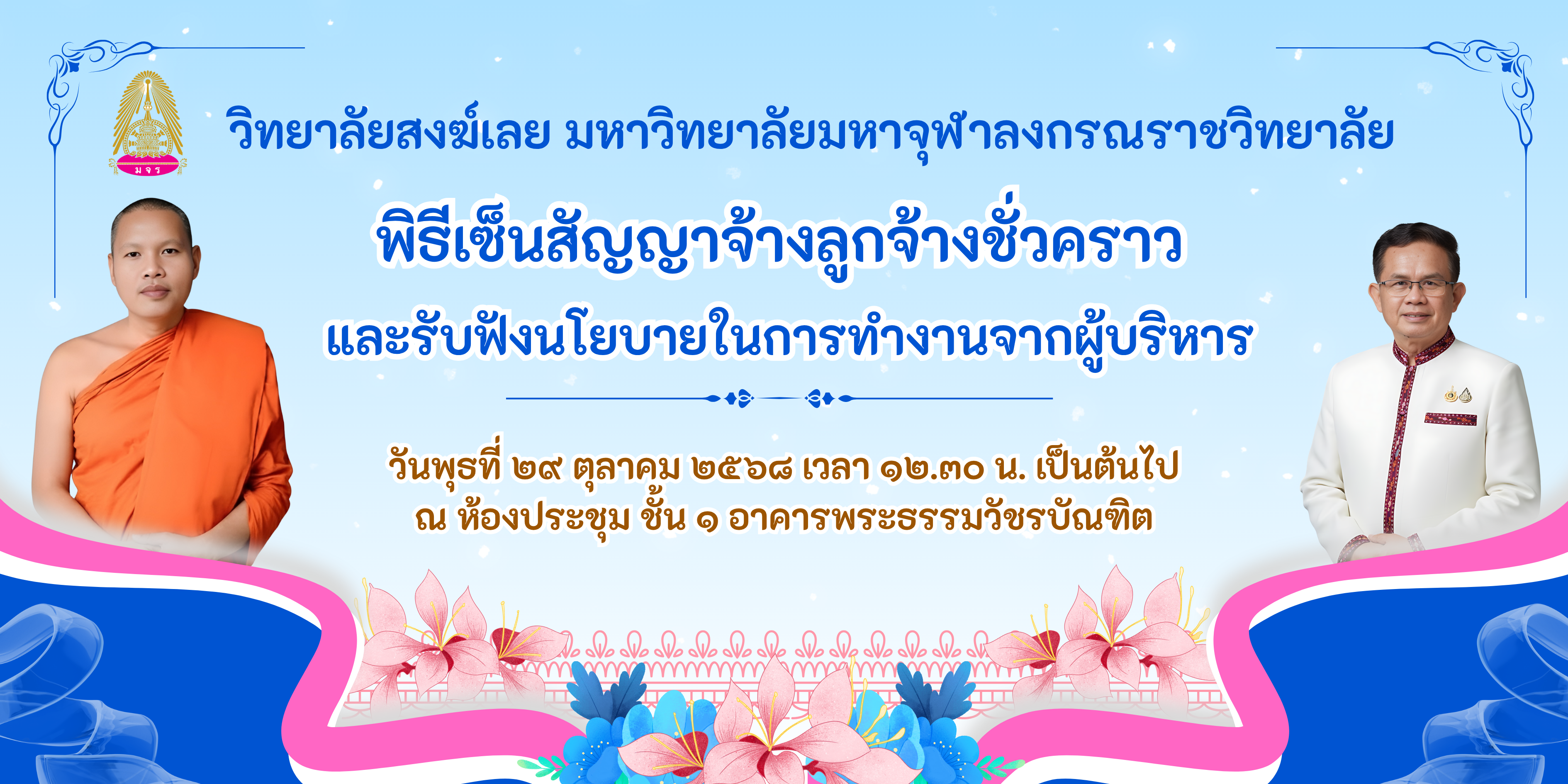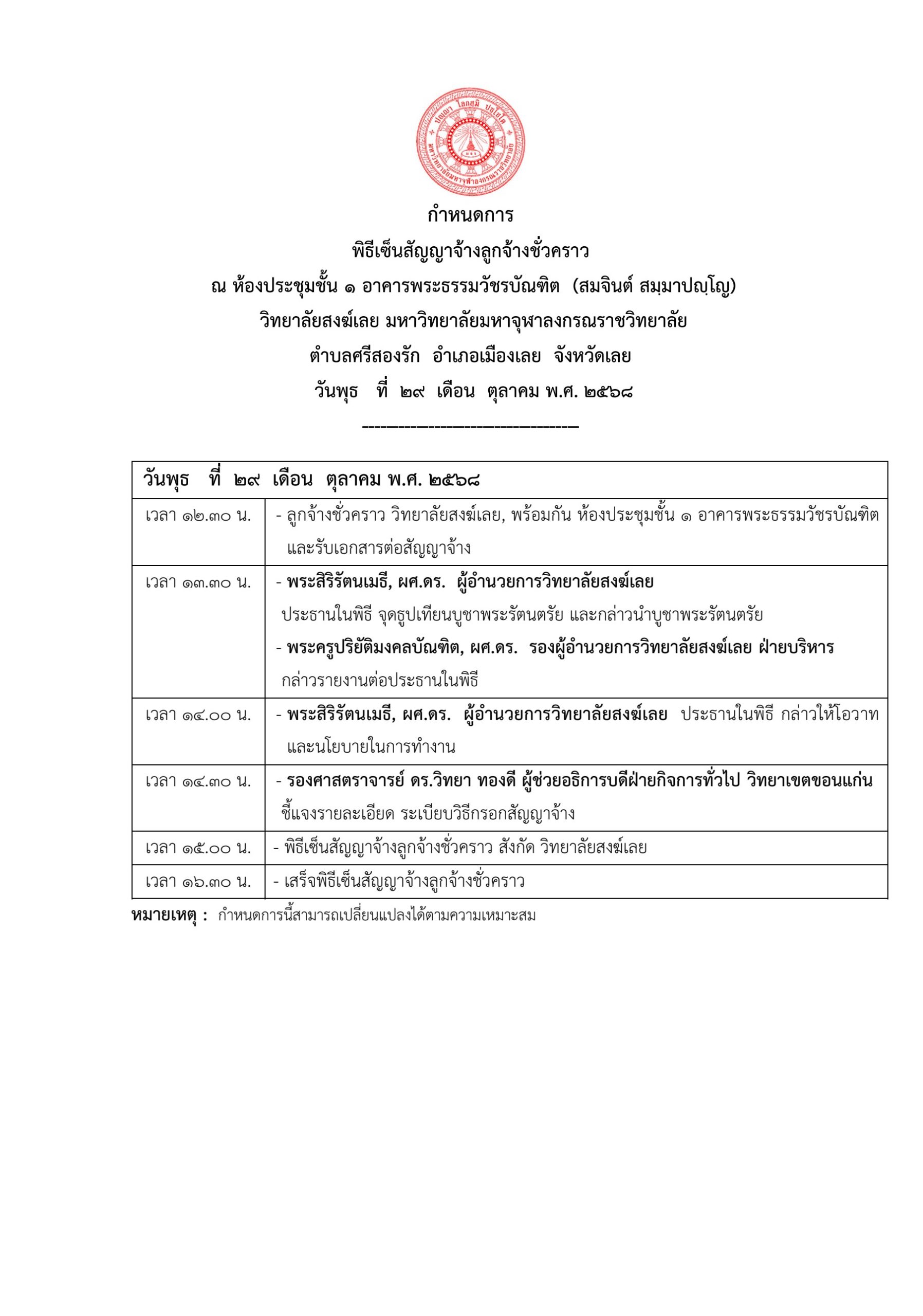 ขอเชิญบุคคลากรลูกจ้างทุกท่านเข้าร่วมพิธีเซ็นสัญญาจ้างลูกจ้างชั่วคราวและรับฟังนโยบายในการทำงานจากผู้บริหาร