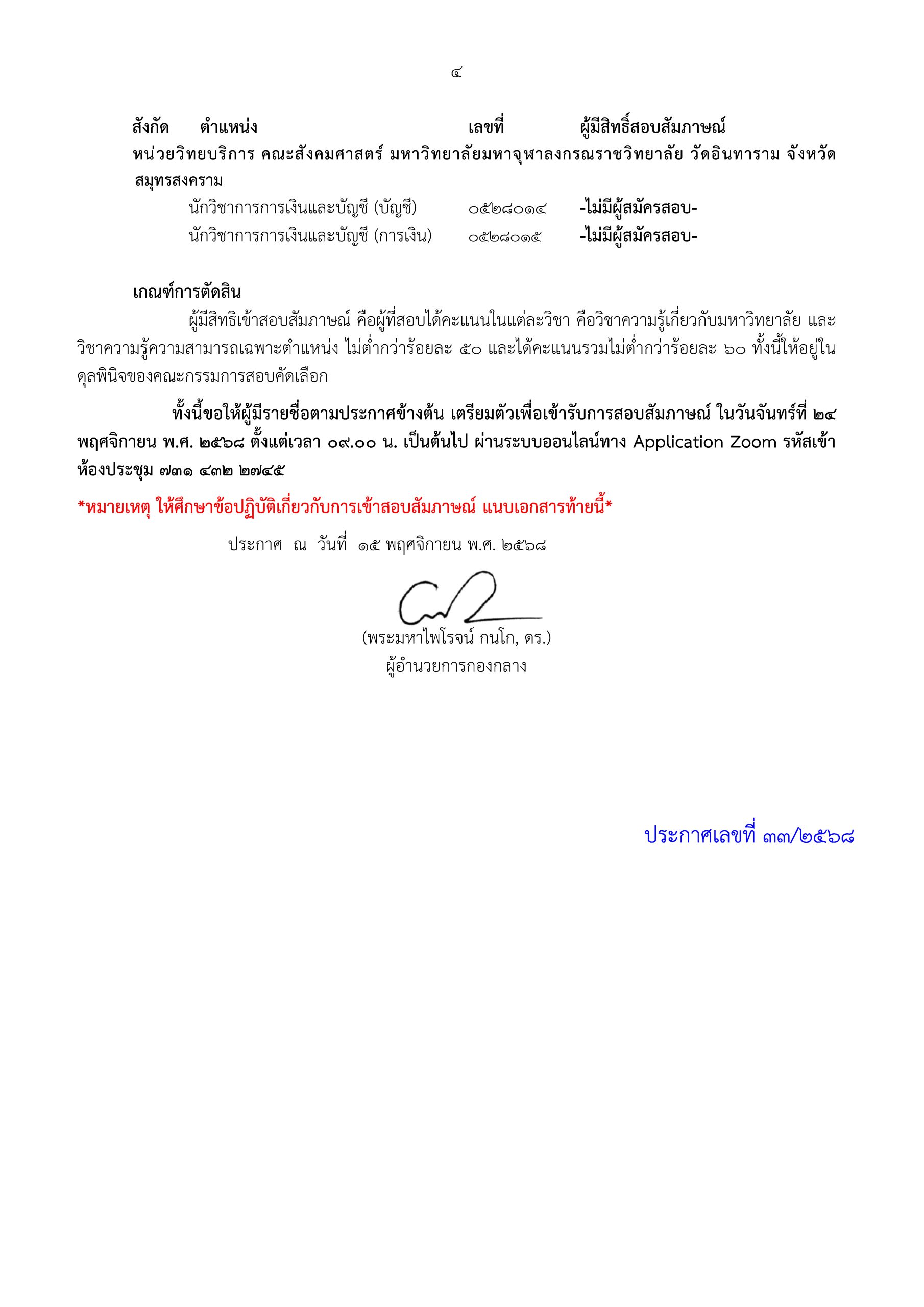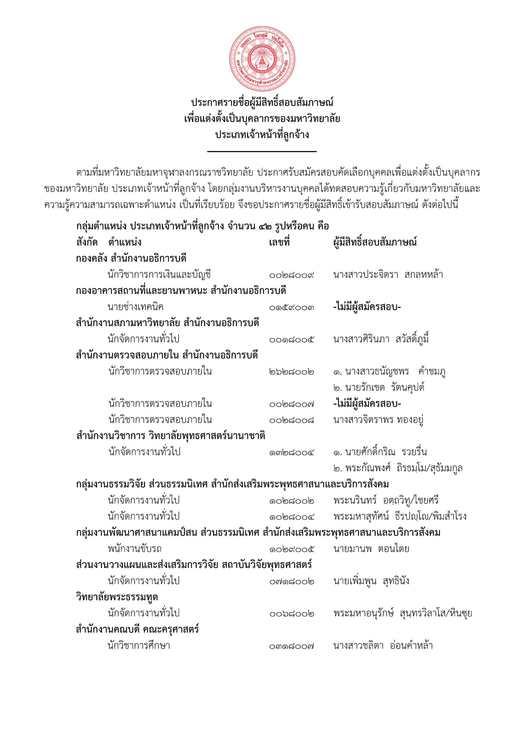ประกาศรายชื่อผู้มีสิทธิ์สอบสัมภาษณ์ประเภทเจ้าหน้าที่ลูกจ้าง เพื่อบรรจุและแต่งตั้งเป็นบุคลากรของมหาวิทยาลัย ครั้งที่ ๔/๒๕๖๘