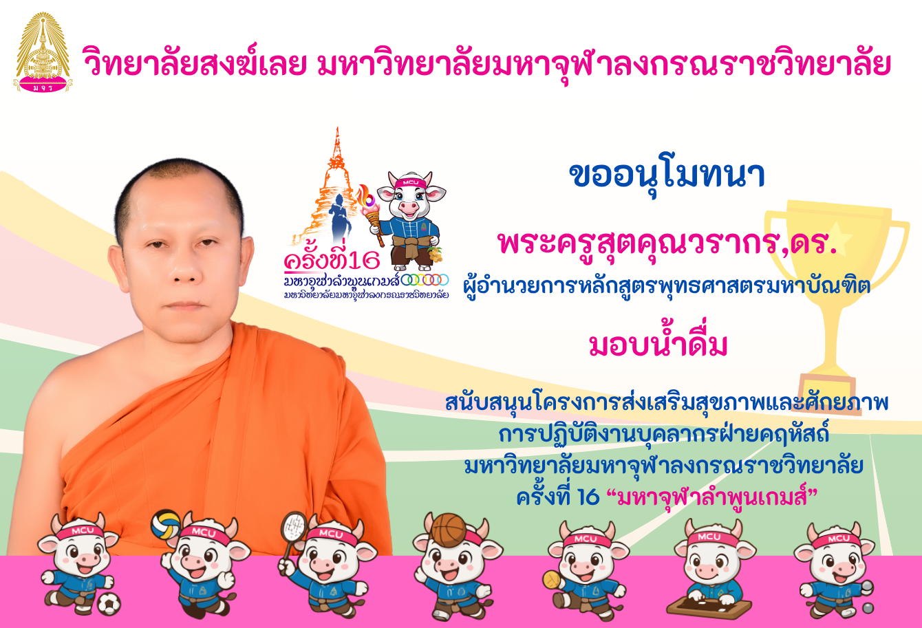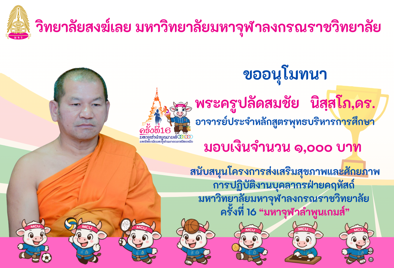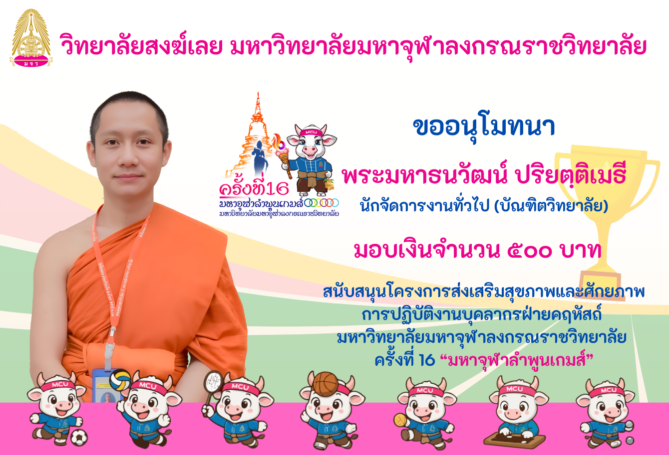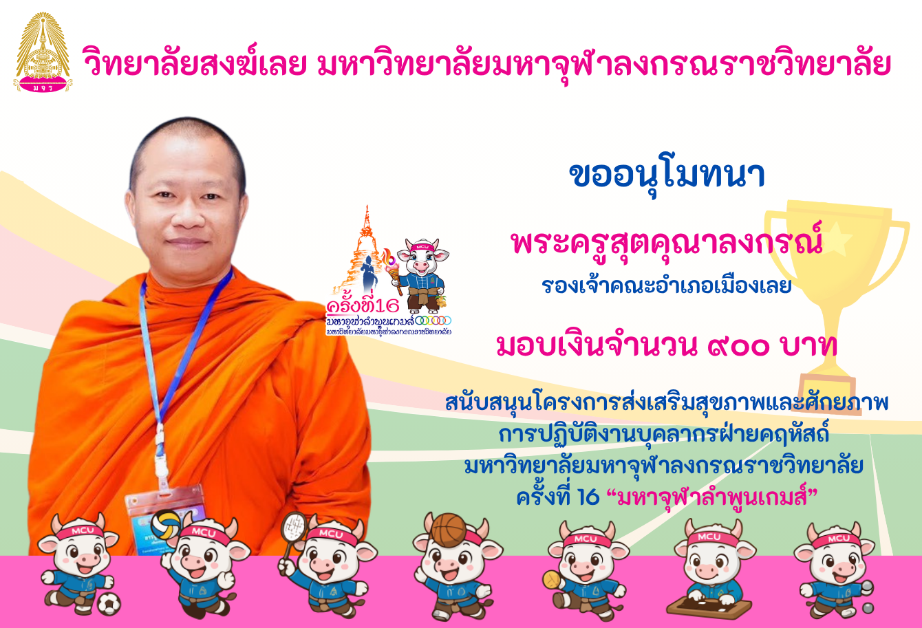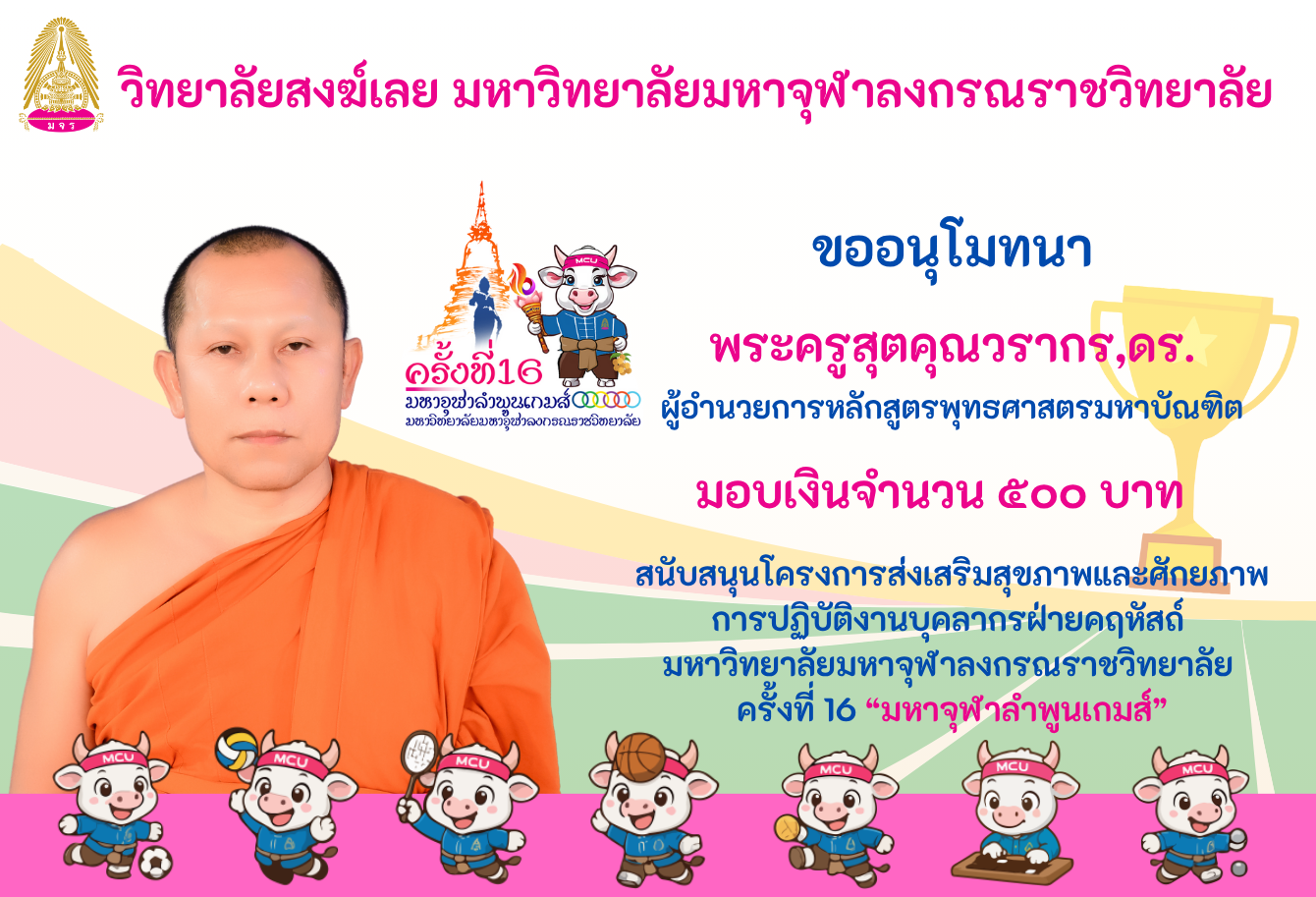 ขออนุโมทนาและขอบพระคุณผู้บริหาร ผู้มีอุปการคุณทุกท่าน ที่เมตตาสนับสนุนนักกีฬาของวิทยาลัยสงฆ์เลย “มหาจุฬาเกมส์ลำพูนเกมส์ ครั้งที่ ๑๖”
