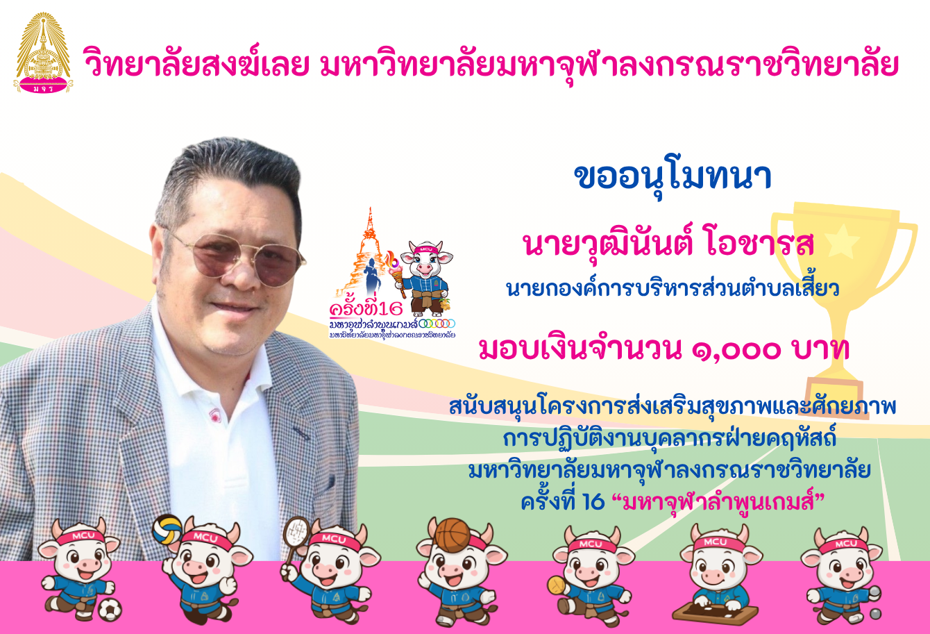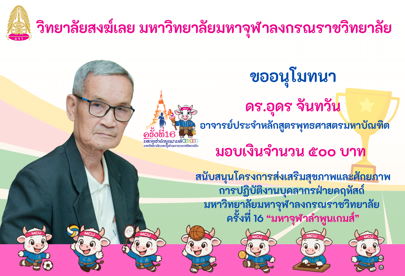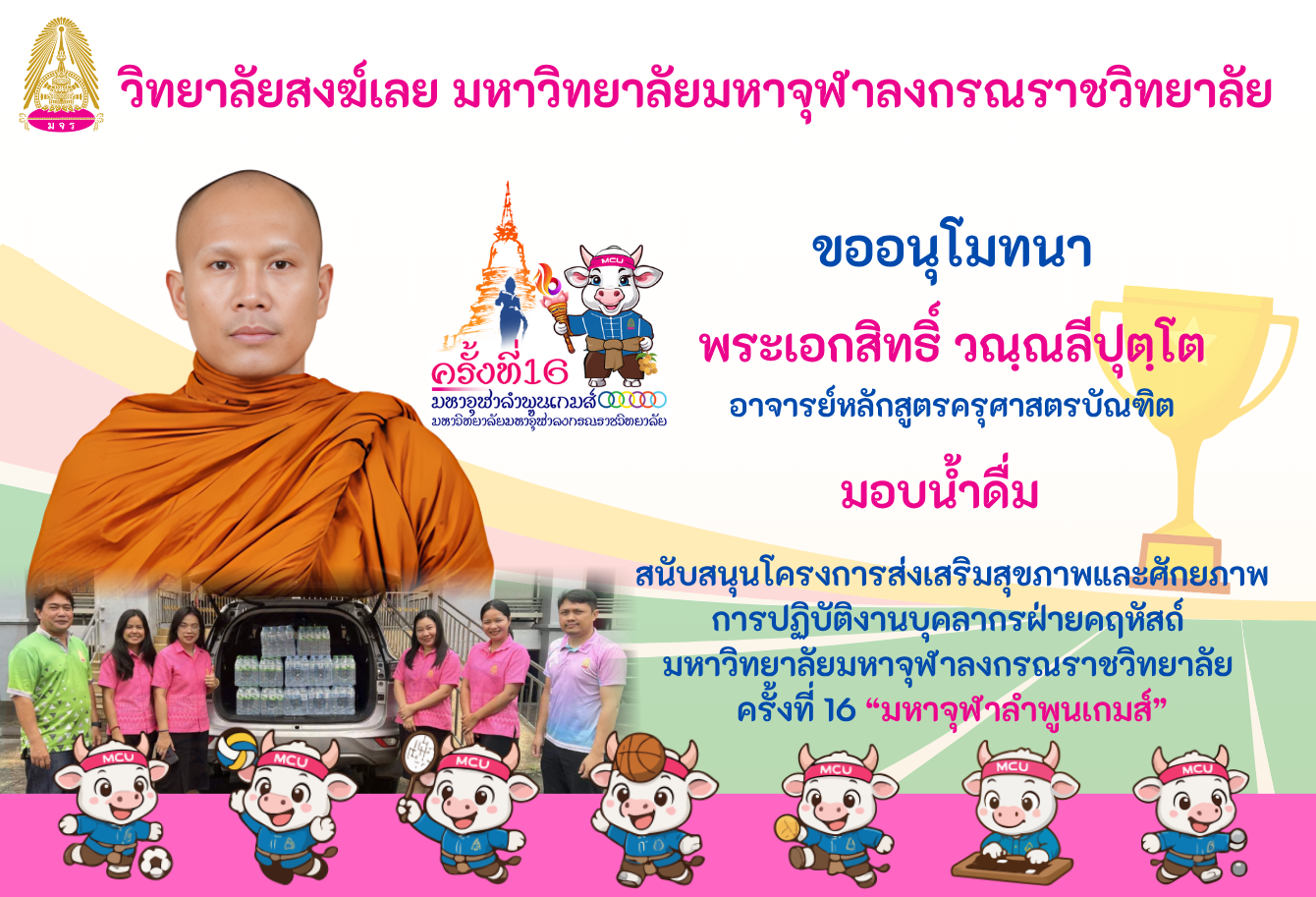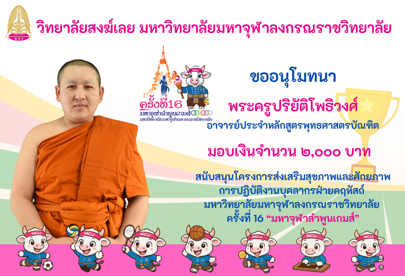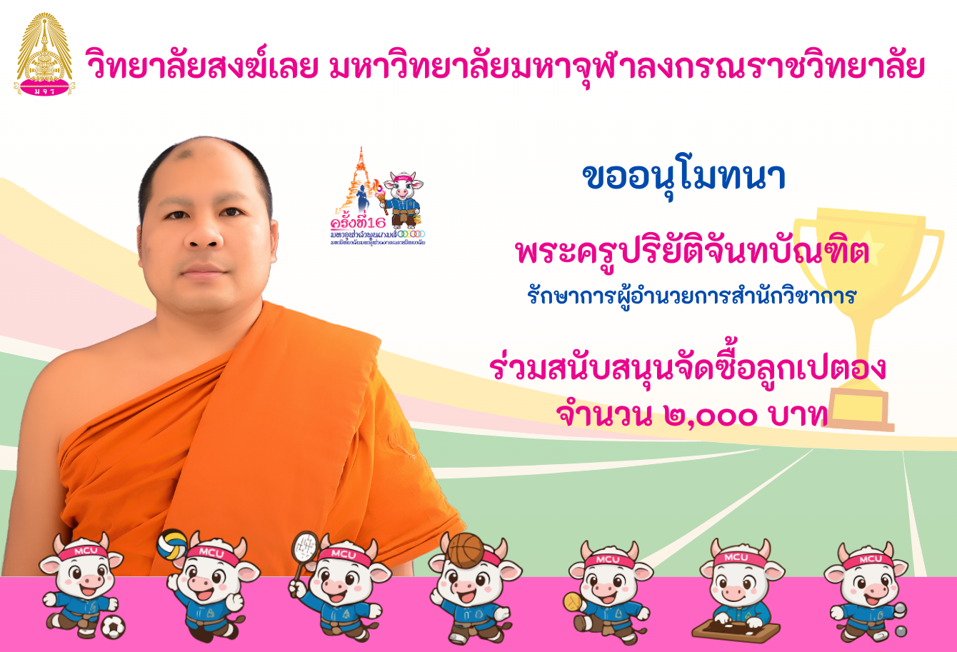ขออนุโมทนาและขอบพระคุณผู้บริหาร ผู้มีอุปการคุณทุกท่าน ที่เมตตาสนับสนุนนักกีฬาของวิทยาลัยสงฆ์เลย “มหาจุฬาเกมส์ลำพูนเกมส์ ครั้งที่ ๑๖”