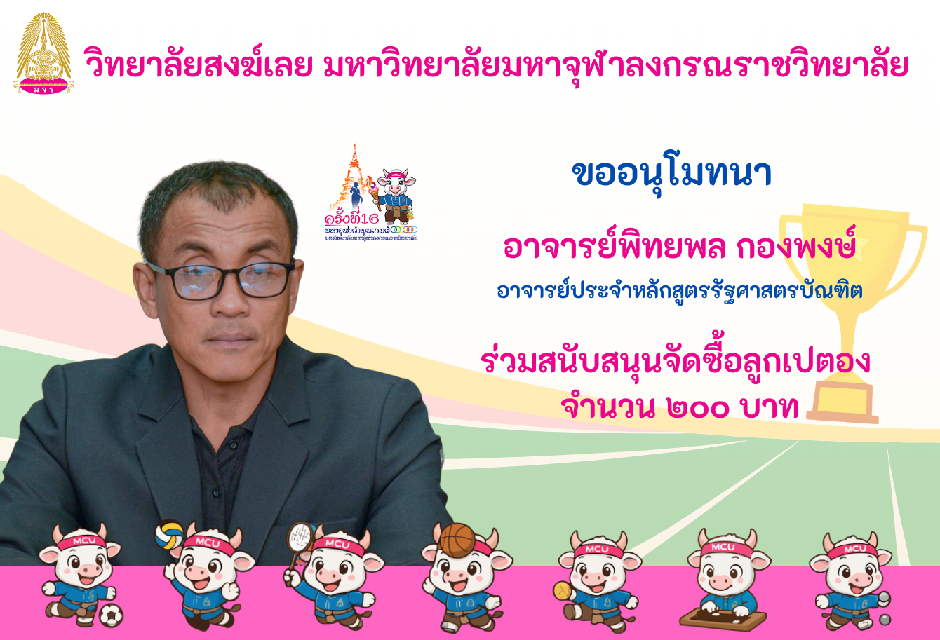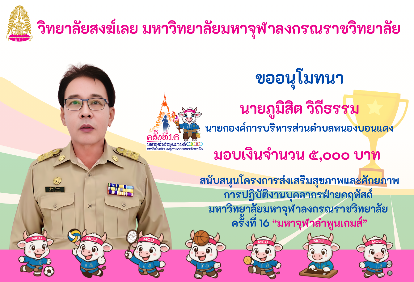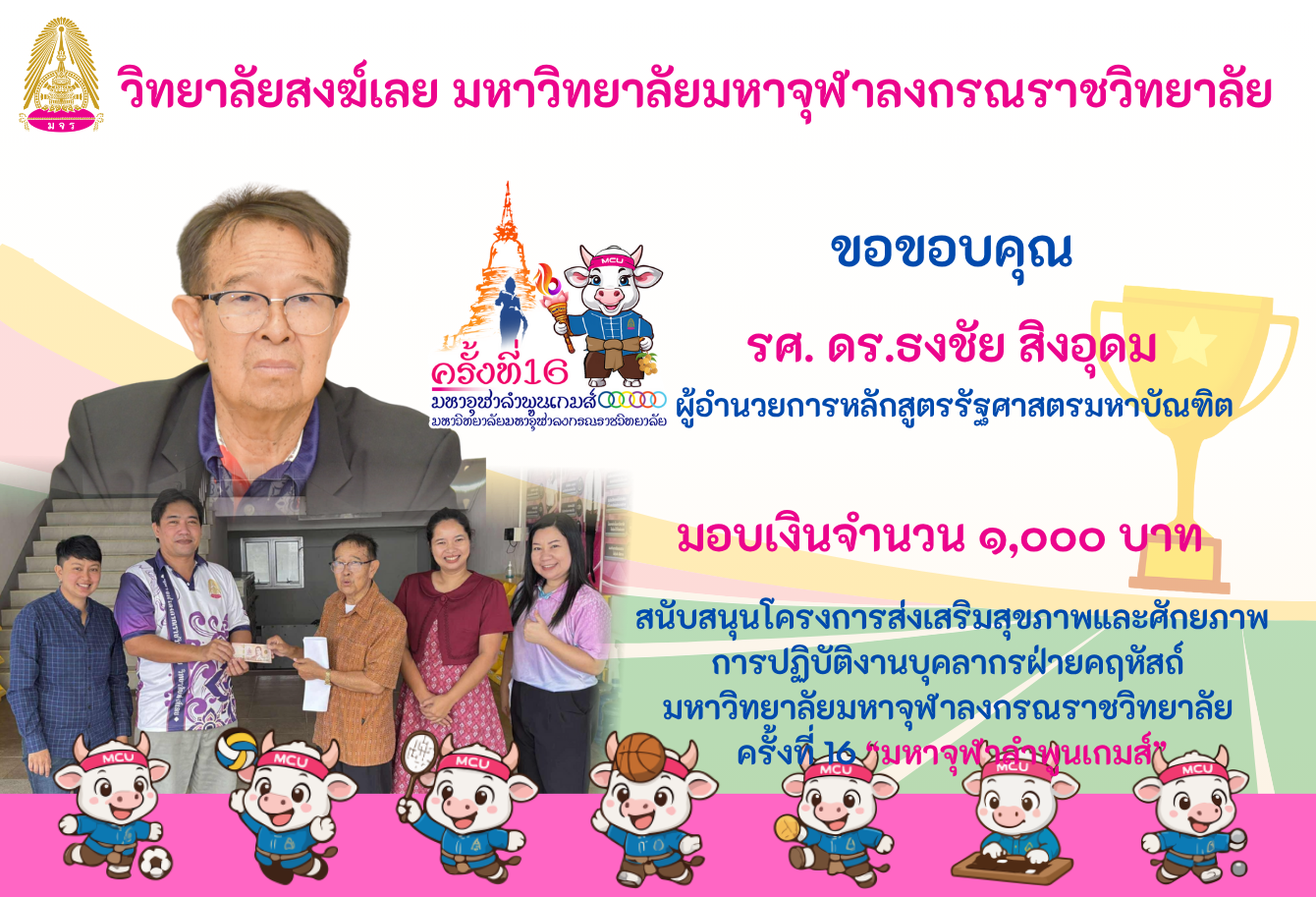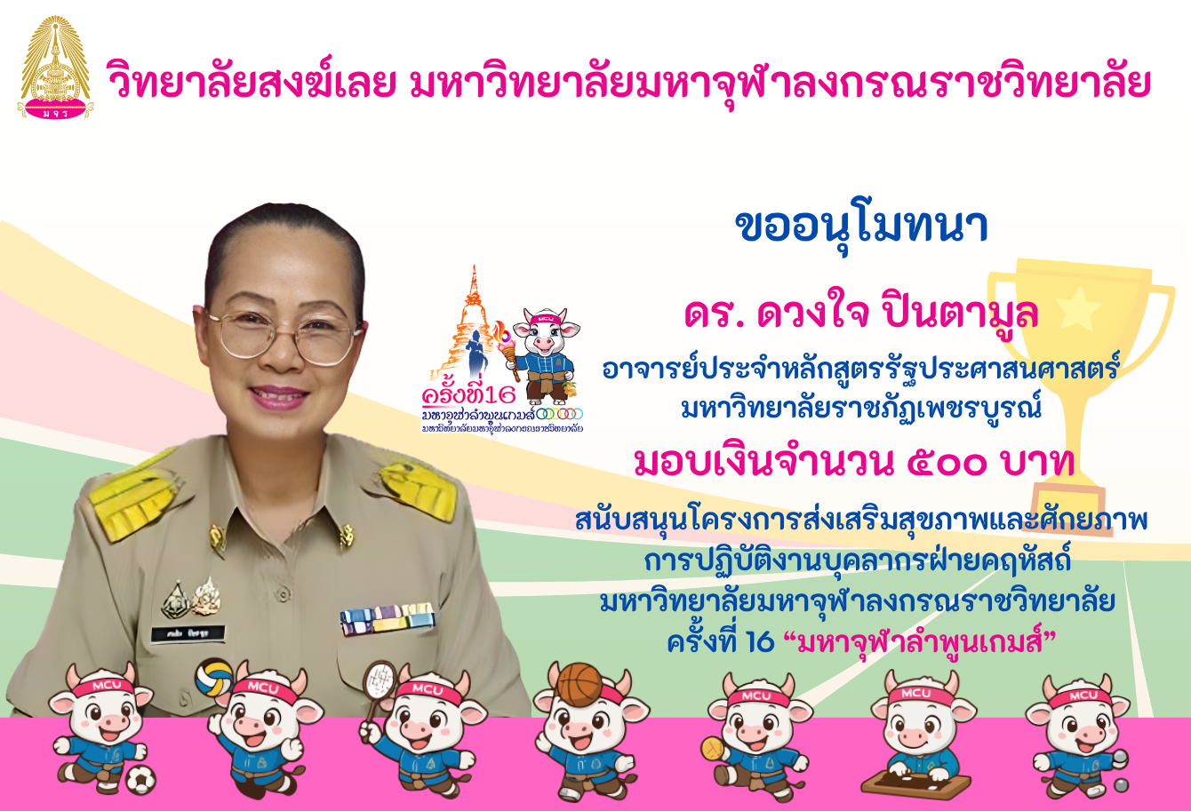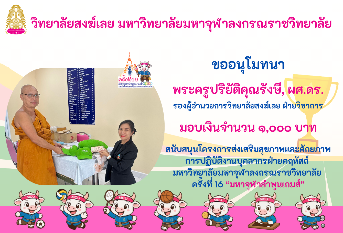 ขออนุโมทนาและขอบพระคุณผู้บริหาร ผู้มีอุปการคุณทุกท่าน ที่เมตตาสนับสนุนนักกีฬาของวิทยาลัยสงฆ์เลย “มหาจุฬาเกมส์ลำพูนเกมส์ ครั้งที่ ๑๖”
