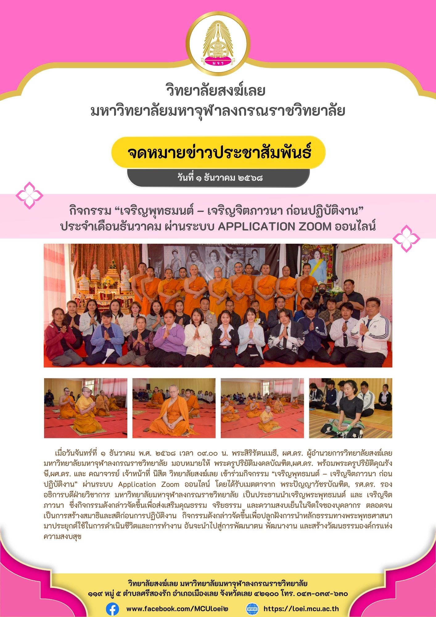 กิจกรรม “เจริญพุทธมนต์ – เจริญจิตภาวนา ก่อนปฏิบัติงาน”ประจำเดือนธันวาคม ผ่านระบบ Application Zoom ออนไลน์