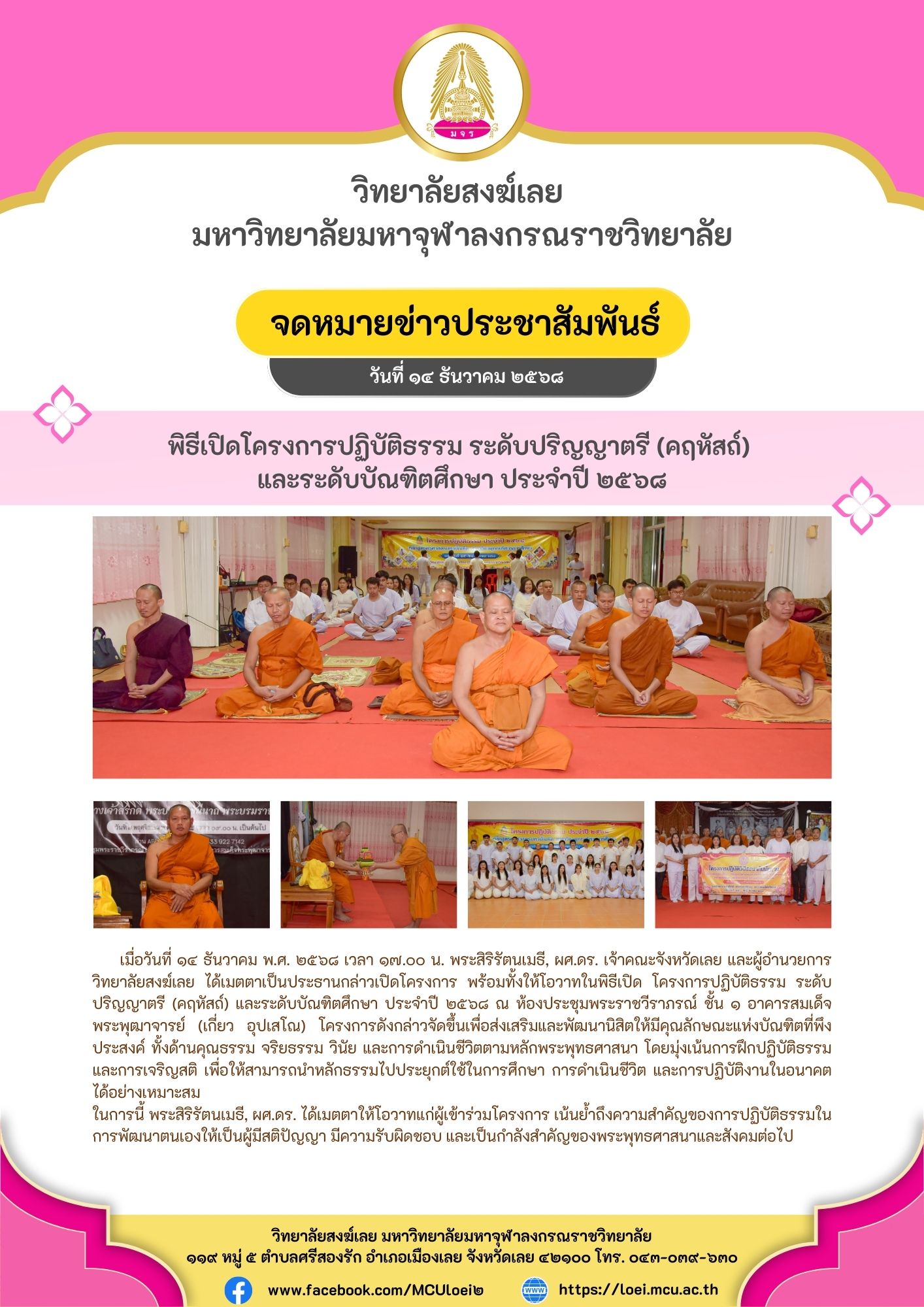พิธีเปิดโครงการปฏิบัติธรรม ระดับปริญญาตรี (คฤหัสถ์) และรับดับบัณฑิตศึกษา ประจำปี ๒๕๖๘