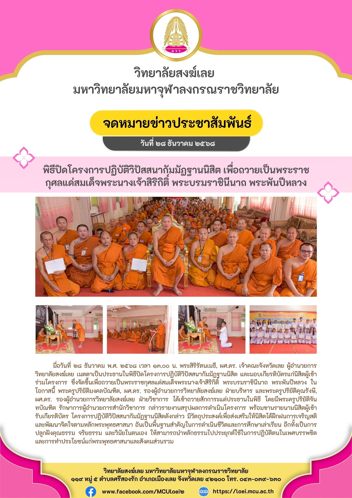 พิธีปิดโครงการปฏิบัติวิปัสสนากัมมัฏฐานนิสิต เพื่อถวายเป็นพระราชกุศลแด่สมเด็จพระนางเจ้าสิริกิติ์ พระบรมราชินีนาถ พระพันปีหลวง