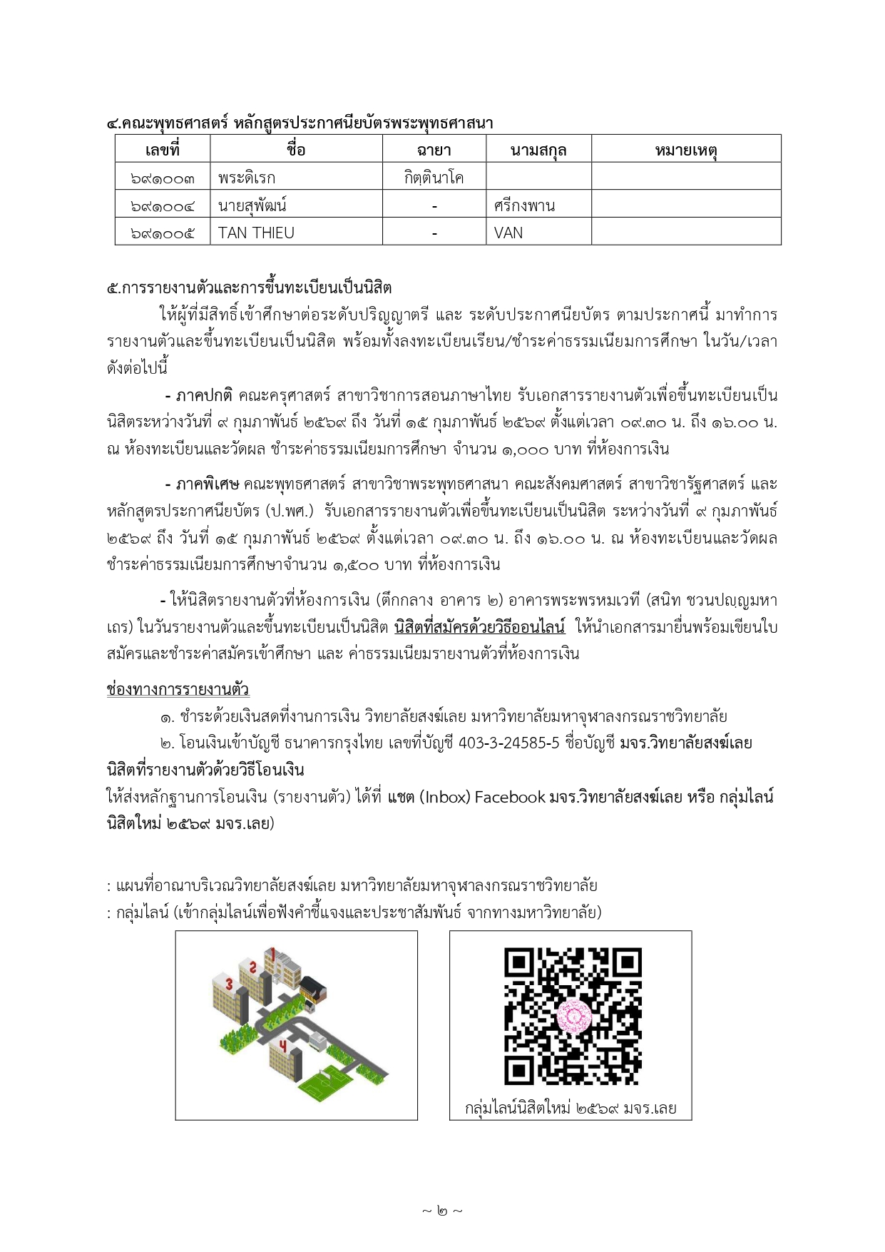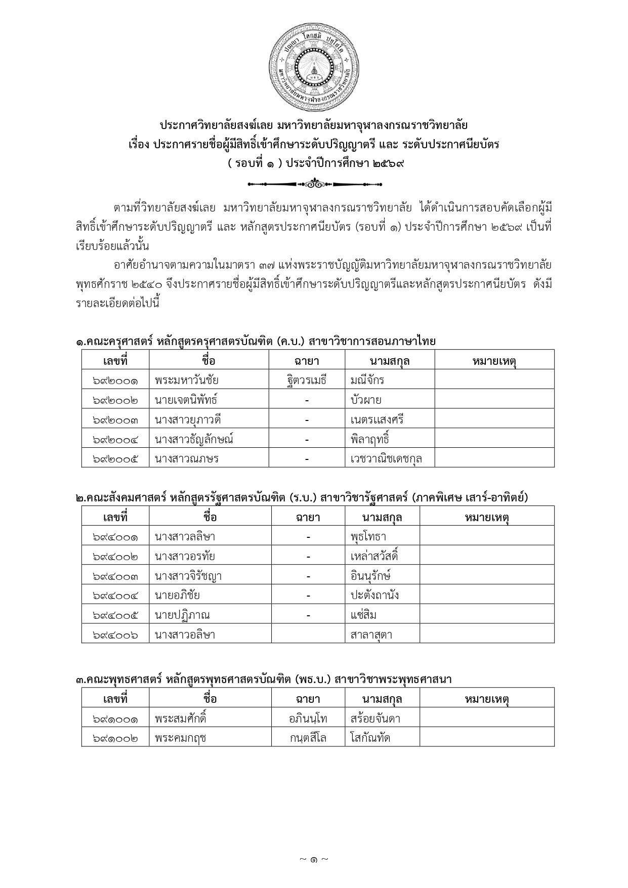 ประกาศรายชื่อผู้มีสิทธิ์เข้าศึกษาระดับปริญญาตรี และ ระดับประกาศนียบัตร (รอบที่ ๑) ประจำปีการศึกษา ๒๕๖๙