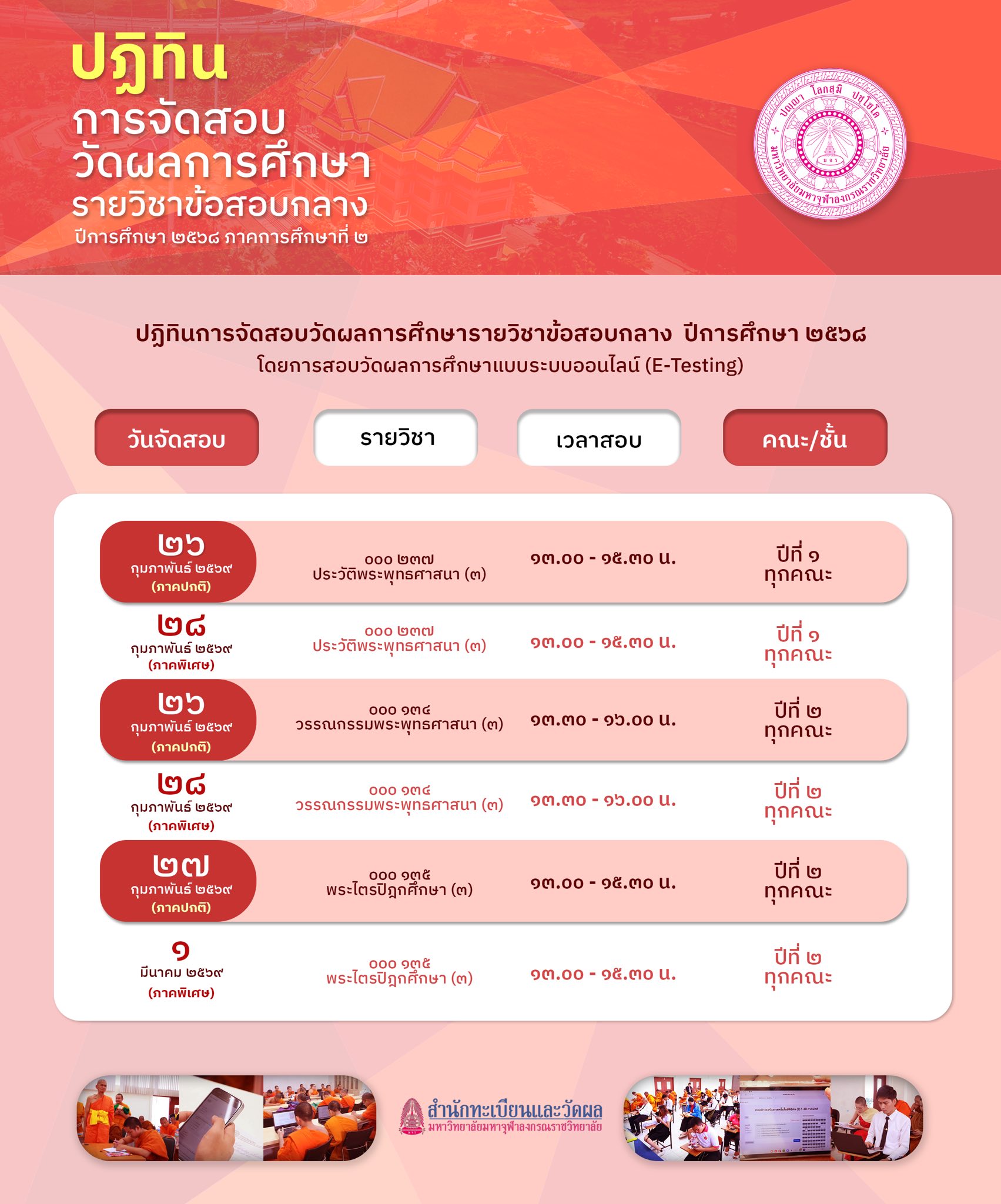 ปฏิทินการจัดสอบวัดผลการศึกษา รายวิชาข้อสอบกลาง ภาคการศึกษาที่ ๒ ปีการศึกษา ๒๕๖๘