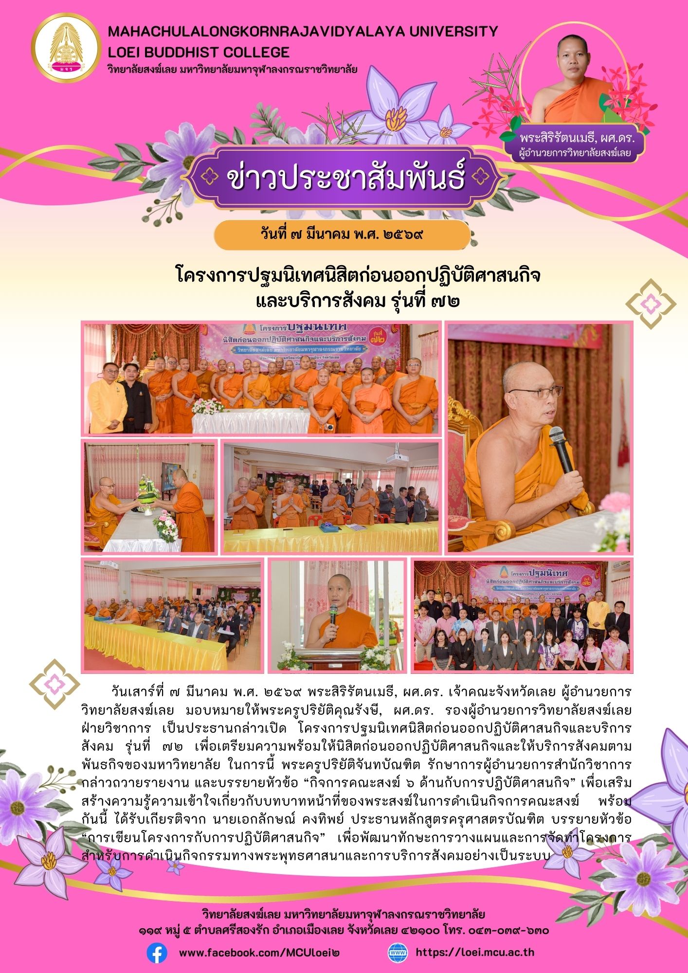 โครงการปฐมนิเทศนิสิตก่อนออกปฏิบัติศาสนกิจและบริการสังคม รุ่นที่ ๗๒