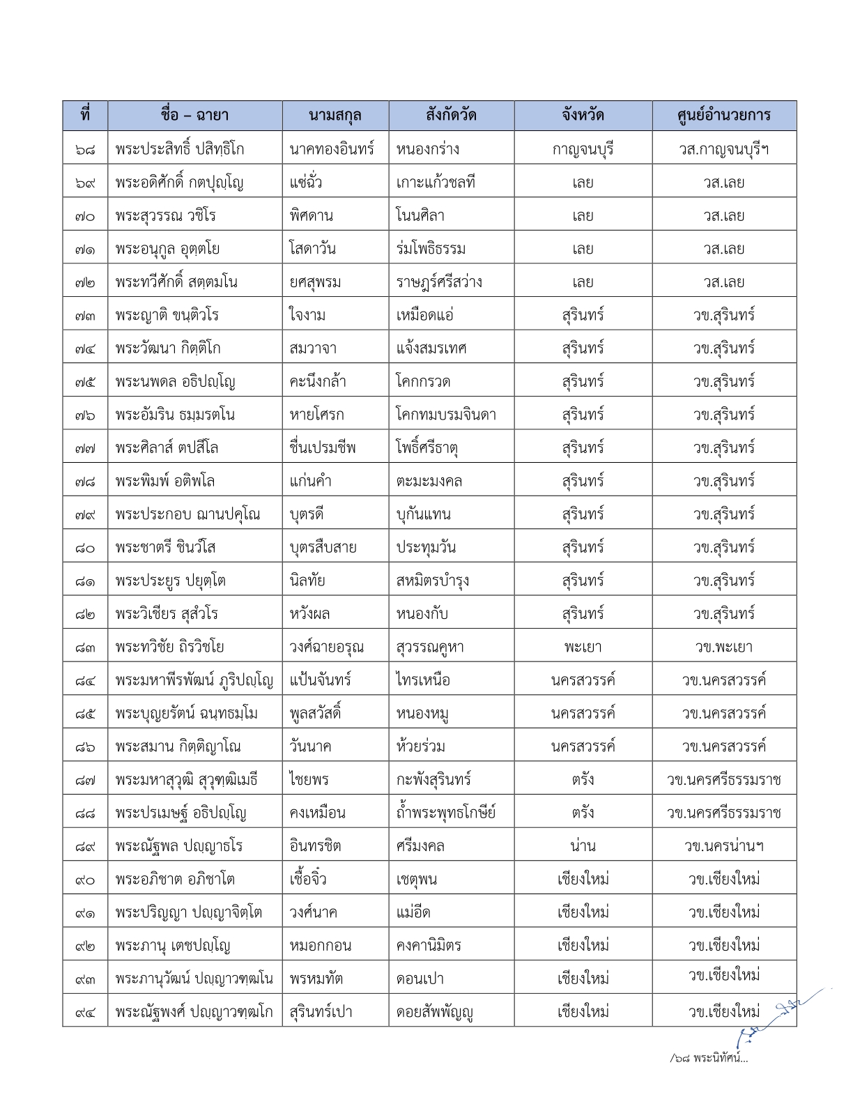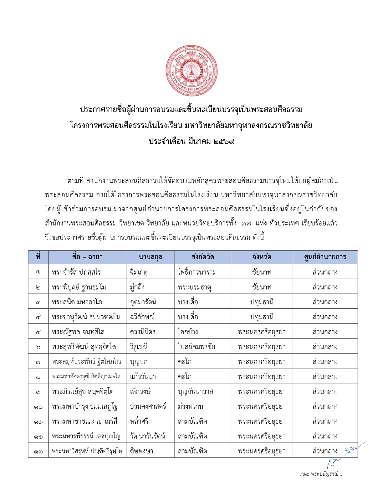 ประกาศรายชื่อผู้ผ่านการอบรมและขึ้นทะเบียนบรรจุเป็นพระสอนศีลธรรม ประจำเดือน มีนาคม ๒๕๖๙