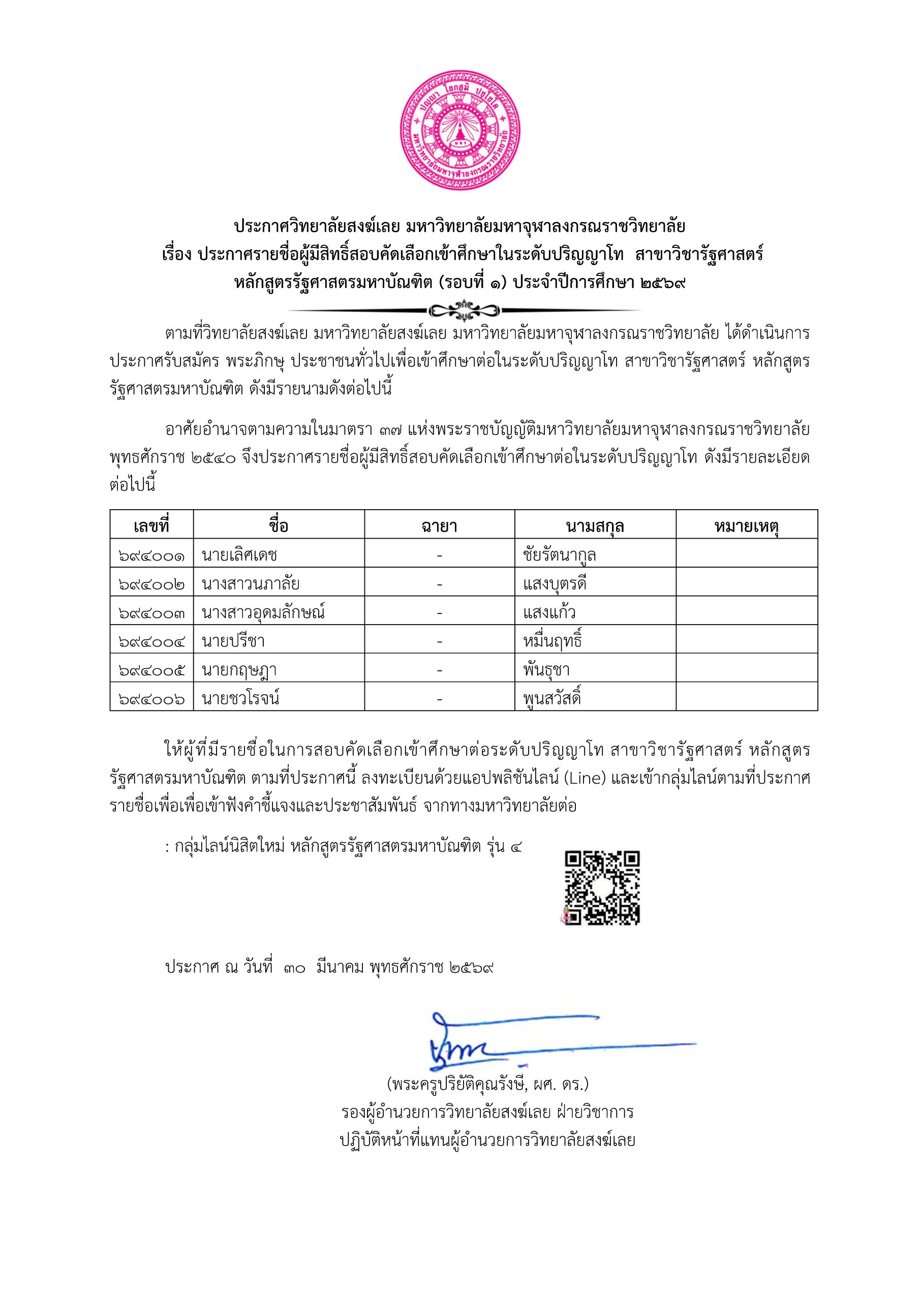 ประกาศรายชื่อผู้มีสิทธิ์สอบคัดเลือกเข้าศึกษาในระดับปริญญาโท สาขาวิชารัฐศาสตร์ (รอบที่ ๑) ประจำปีการศึกษา ๒๕๖๙